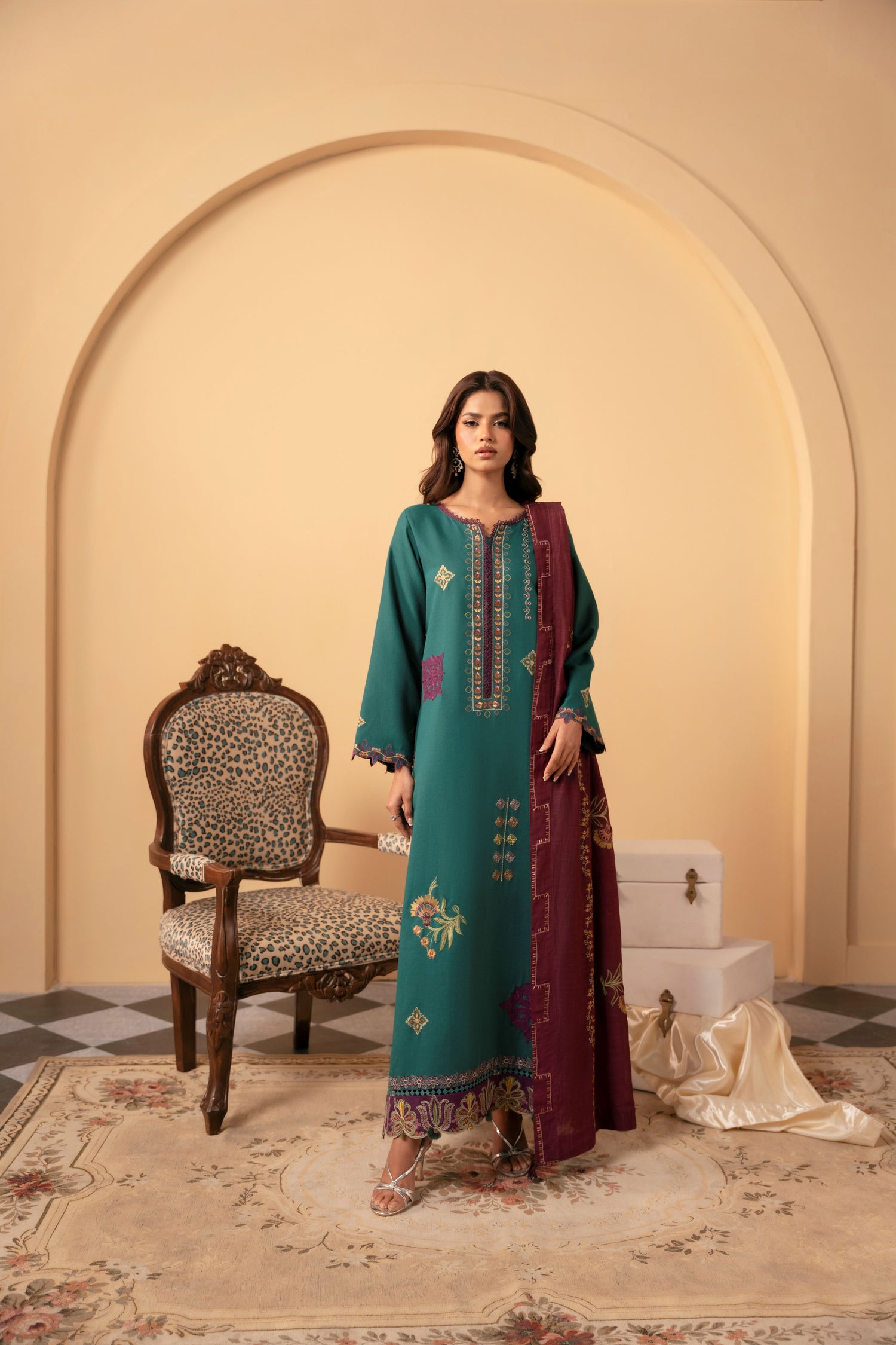 This collection features stitched jacquard suits that blend traditional eastern designs with...